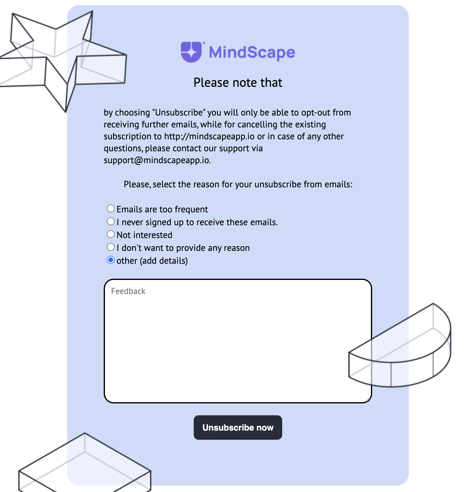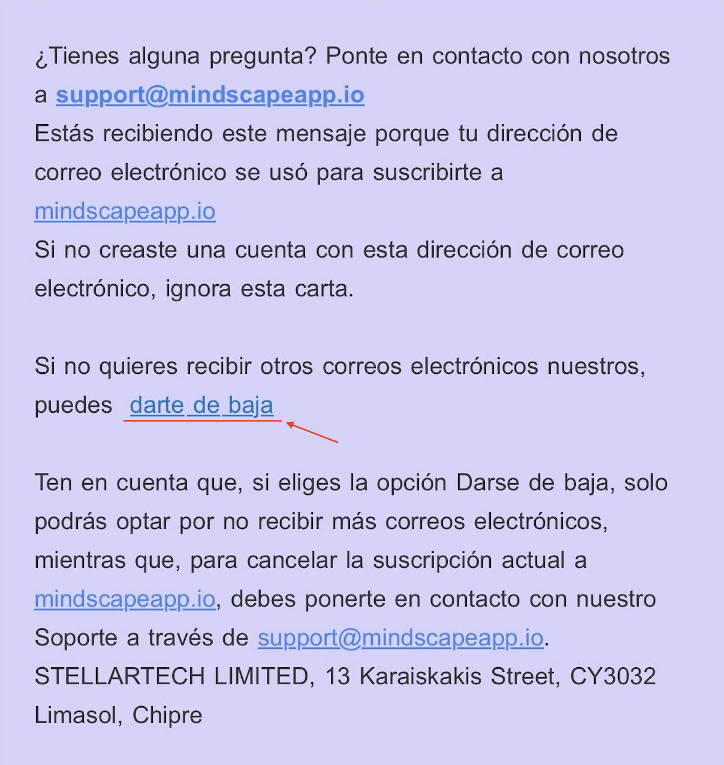 Si quieres darte de baja del boletín, simplemente haz clic en el botón "Darse de baja" situado en la parte inferior del correo electrónico enviado desde info@mindscapeapp.io
